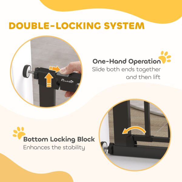 • Double-Locking System: Adult can open the door with a single hand by sliding the button on the top (Need to slide both ends at the same time and then lift). The dog gate comes with the bottom locking block to enhance stability and ensure pet safety.